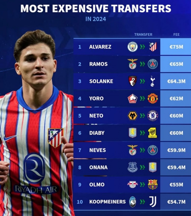 12月30日訊 2024年臨近尾聲,《轉(zhuǎn)會(huì)市場(chǎng)》也統(tǒng)計(jì)了今年的轉(zhuǎn)會(huì)費(fèi)最貴榜,阿爾瓦雷斯以7500萬(wàn)歐轉(zhuǎn)會(huì)費(fèi)居首。