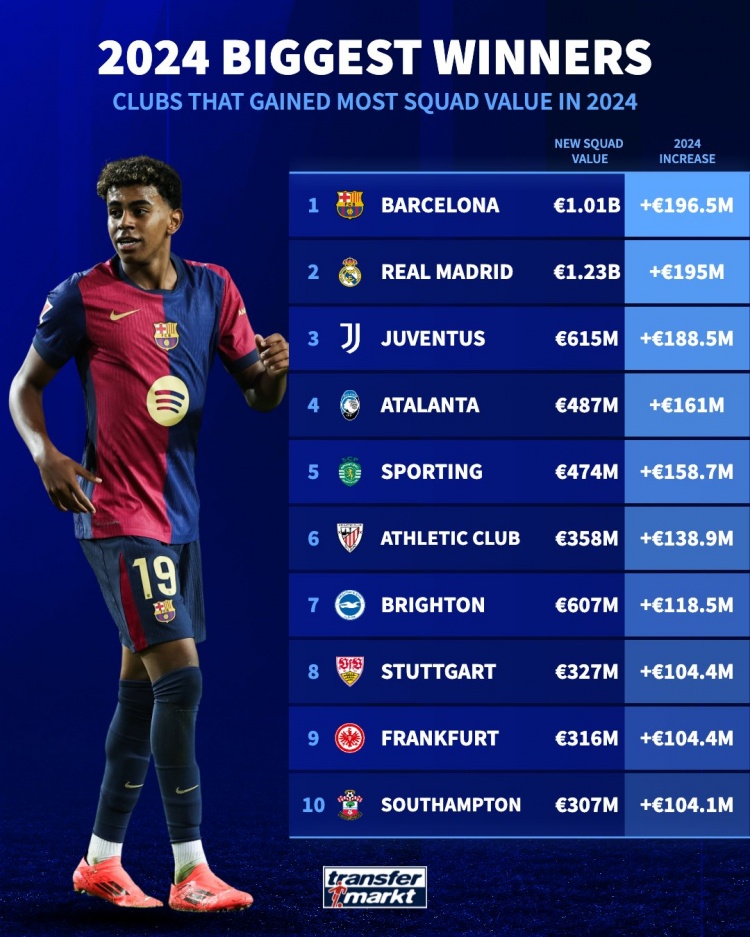 除特別注明外,本站所有內(nèi)容均為24直播網(wǎng)整理排版,轉(zhuǎn)載請注明出處:2024年球隊(duì)德轉(zhuǎn)身價(jià)上漲榜:巴薩1.965億歐居首,皇馬、尤文前三