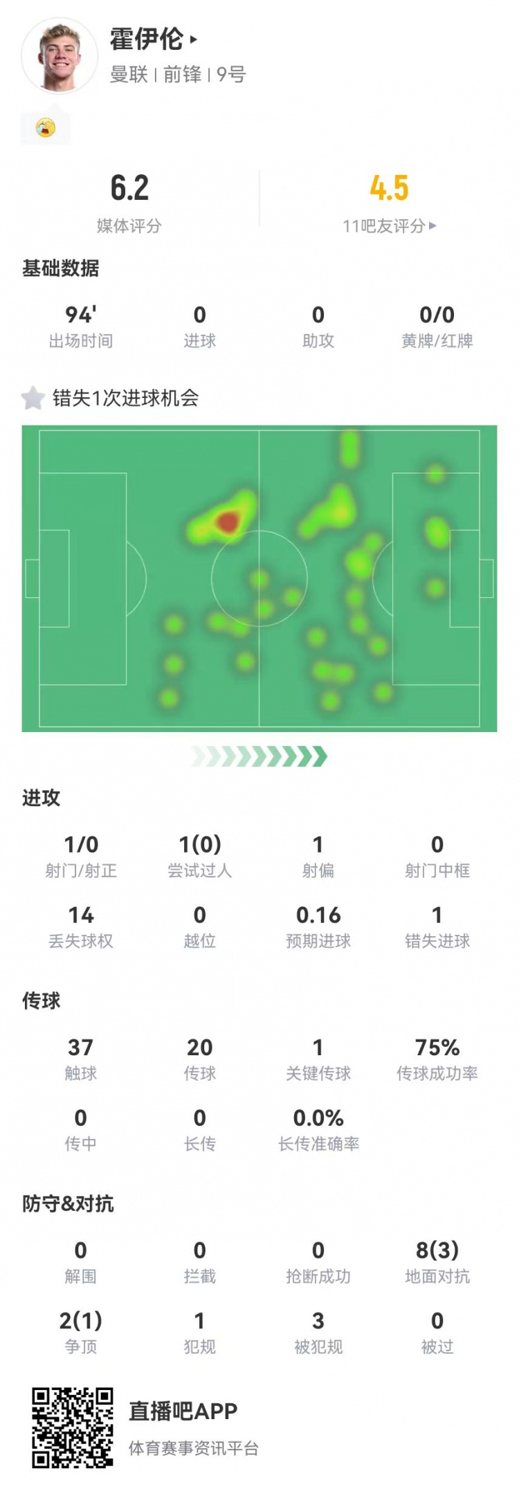 12月31日訊 曼聯(lián)在本輪英超0-2不敵紐卡,首發(fā)中鋒霍伊倫本場(chǎng)數(shù)據(jù)如下: