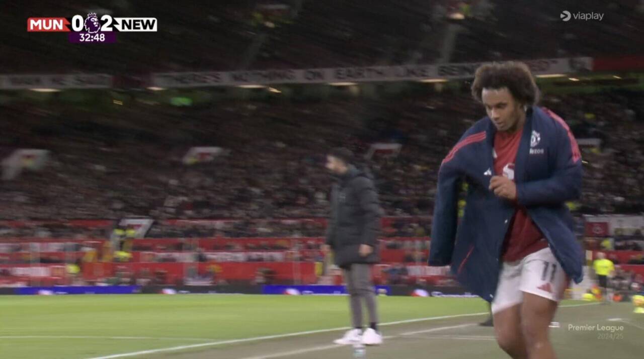 比賽上半場,曼聯(lián)連丟2球0-2落后紐卡,主帥阿莫林將齊爾克澤提前換下,梅努替補(bǔ)登場。