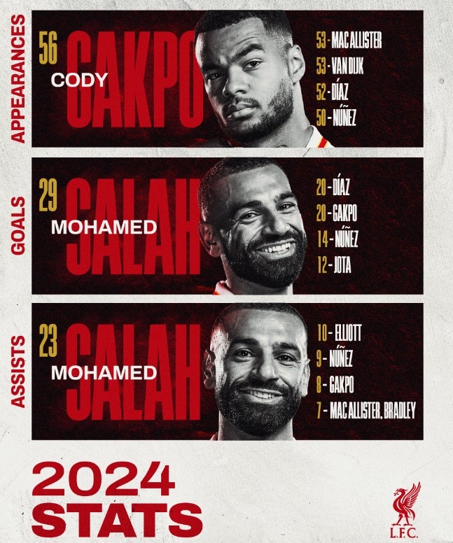 12月31日訊 2025年即將來(lái)臨之際,利物浦官方盤點(diǎn)了球隊(duì)2024年的一些數(shù)據(jù),其中加克波成為紅軍出勤王,薩拉赫在進(jìn)球和助攻方面都位居隊(duì)內(nèi)榜首。