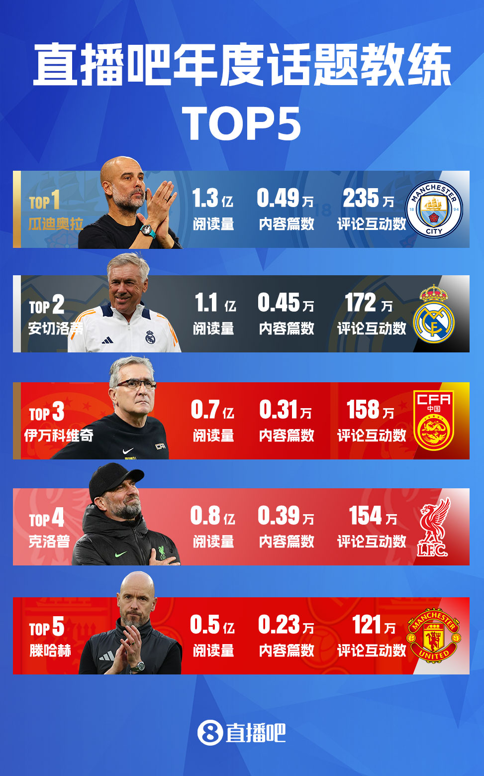 - 直播吧2024年度五大話題教練:瓜迪奧拉領(lǐng)銜,伊萬、滕哈赫在列