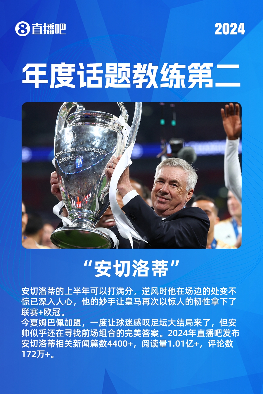 今夏姆巴佩加盟,一度讓球迷感嘆足壇大結(jié)局來了,但安帥似乎還在尋找前場組合的完美答案。2024年發(fā)布安切洛蒂相關(guān)新聞篇數(shù)4400+,閱讀量1.01億+,評論數(shù)172萬+。
