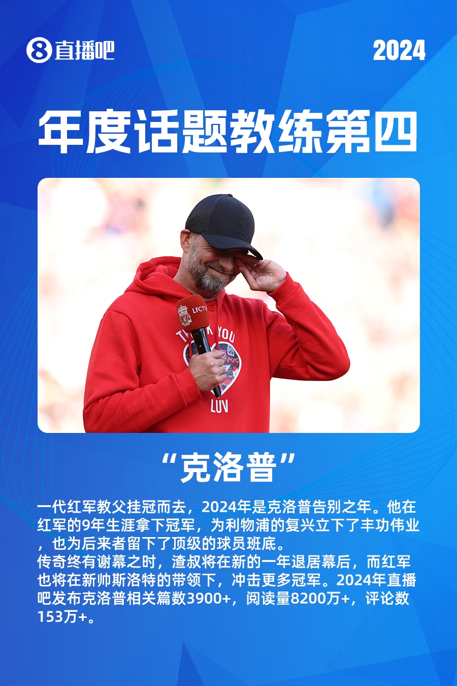 傳奇終有謝幕之時,渣叔將在新的一年退居幕后,而紅軍也將在新帥斯洛特的帶領(lǐng)下,沖擊更多冠軍。2024年發(fā)布克洛普相關(guān)篇數(shù)3900+,閱讀量8200萬+,評論數(shù)153萬+。