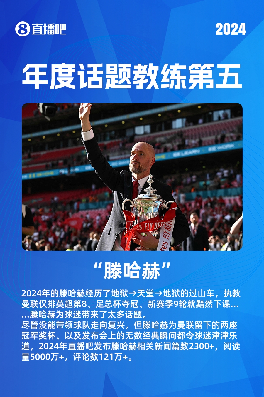 盡管沒能帶領(lǐng)球隊走向復興,但滕哈赫為曼聯(lián)留下的兩座冠軍獎杯、以及發(fā)布會上的無數(shù)經(jīng)典瞬間都令球迷津津樂道,2024年發(fā)布滕哈赫相關(guān)新聞2300+,閱讀量5000萬+,評論數(shù)121萬+。