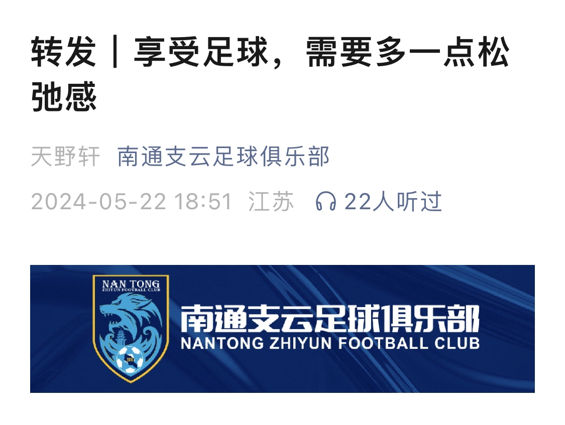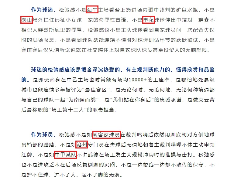 今年5月,南通支云官方賬號轉(zhuǎn)載了一篇題為《享受足球,需要多一點松弛感》的文章。這篇文章火力全開,內(nèi)涵了海牛、泰山、申花等多隊球迷。