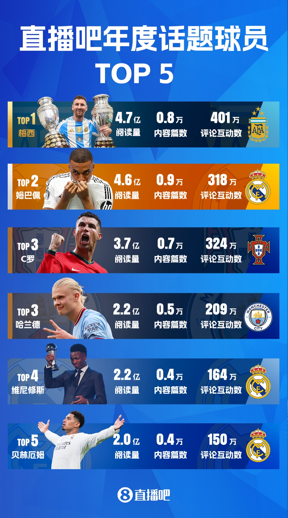 發(fā)布時間:2024年12月31日 14:00點擊:欄目:足球新聞 你可以喜歡他們,也可以討厭他們,但你肯定無法忽視他們。2024年這個足球大年過去了,眾多球星都留下了濃墨重彩,吸引了吧友們最多目光的球員是哪幾位呢? 除特別注明外,本站所有內(nèi)容均為24直播網(wǎng)整理排版,轉載請注明出處:直播吧2024年五大話題球員:梅西連霸,C羅魔人并列,皇馬3將入選 本文標簽: 邁阿密國際 利雅得勝利 C羅 梅西 姆巴佩 哈蘭德 貝林厄姆 英超 曼城 西甲 皇家馬德里 足球 上一篇:隊史中超出場王退役!曹赟定正式退役,他為申花出戰(zhàn)302場中超 下一篇:返回列表