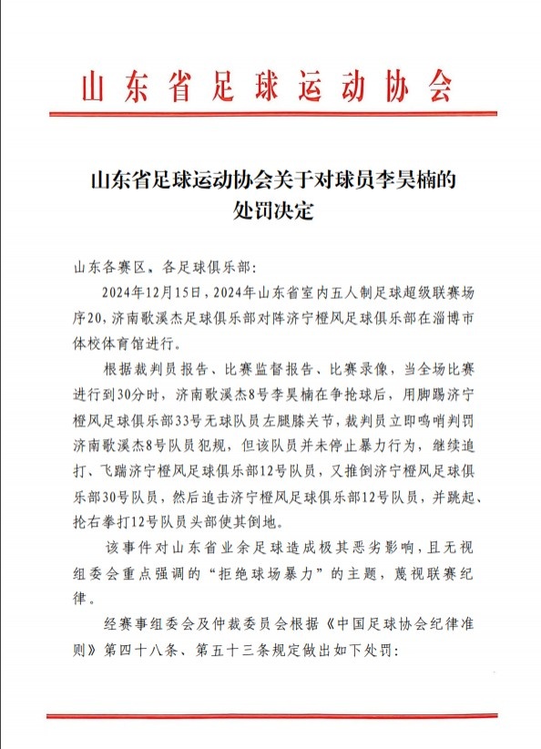 經(jīng)賽事組委會及仲裁委員會根據(jù)《中國足球協(xié)會紀律準則》第四十八條、第五十三條規(guī)定做出如下處罰:對濟南歌溪杰8號隊員李昊楠取消參賽資格,禁止從事任何山東省足協(xié)組織的與足球有關(guān)的活動3年(其中包括但不限于比賽、培訓(xùn)、投資、管理或其他),自公布之日起至2027年12月16日止,并上報中國足球協(xié)會。山東省足協(xié)將依照《中國足球協(xié)會紀律準則》堅決嚴肅處理各類違規(guī)違紀行為,堅決落實“拒絕球場暴力,享受足球快樂!”主題,凈化賽場風(fēng)氣。希望各參賽隊引以為戒、嚴格自律,共同維護比賽秩序和足球發(fā)展環(huán)境。
