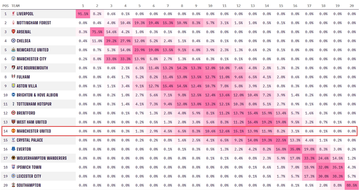 目前權(quán)威數(shù)據(jù)機(jī)構(gòu)Opta給出的排名預(yù)測中,曼聯(lián)奪得第12名的概率為15.1%為最高,而曼聯(lián)排名第5的概率(1.3%)甚至還要高于排名第18降級的概率(0.1%)。