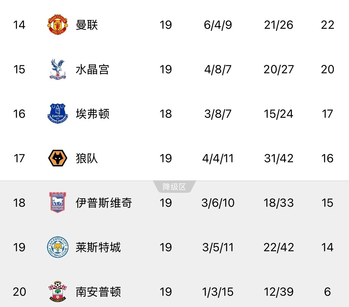 值得一提的是,曼聯(lián)目前凈勝球仍為負(fù)數(shù),目前僅打進(jìn)21球,在進(jìn)球數(shù)上低于降級區(qū)的萊斯特城,藍(lán)狐目前19場打進(jìn)了22球,但總計丟了42球,比曼聯(lián)多丟了16球。目前曼聯(lián)高降級區(qū)7分。