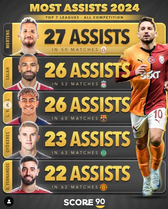12月31日訊 score90統(tǒng)計了歐洲前7聯(lián)賽各項賽事2024年助攻榜,加拉塔薩雷前鋒默滕斯27次第1,薩拉赫、亞馬爾26次第2。