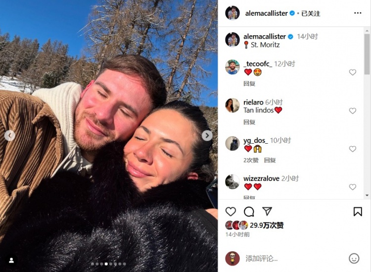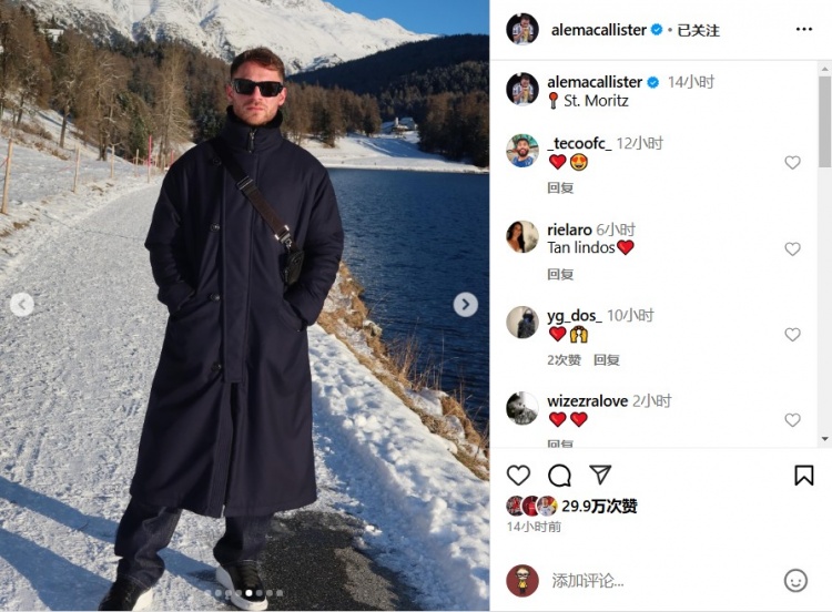 12月31日訊 利物浦中場(chǎng)麥卡利斯特今天在Instagram曬出自己與伴侶在瑞士恩加丁山谷的圣莫里茨度假的照片。