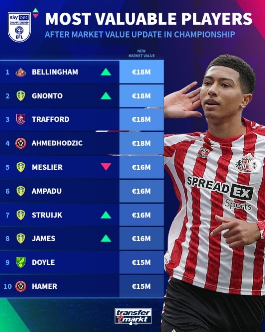 12月31日訊 德轉(zhuǎn)列出了英冠球員身價榜前10,桑德蘭19歲中場喬貝-貝林厄姆1800萬歐并列第一。