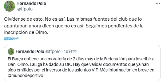 Fernando Polo發(fā)文稱巴薩獲得了西足協3天延期來完成奧爾莫的注冊,西甲聯盟也同意了。巴薩出售諾坎普VIP席位的文件還需獲得驗證。不過,他隨后更新消息:“忘記這事吧。情況不是這樣的。同一位俱樂部消息人士現在說情況不是這樣的。我們仍在等待奧爾莫的注冊。”