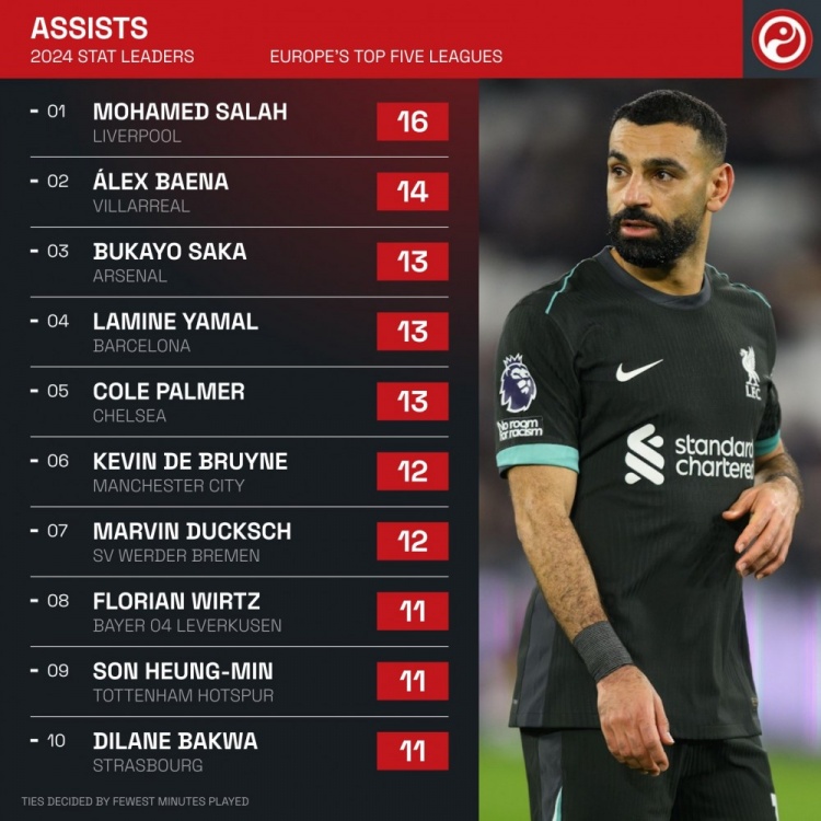 1月1日訊 Squawka統(tǒng)計(jì)了五大聯(lián)賽2024年的助攻榜,薩拉赫16次第一。