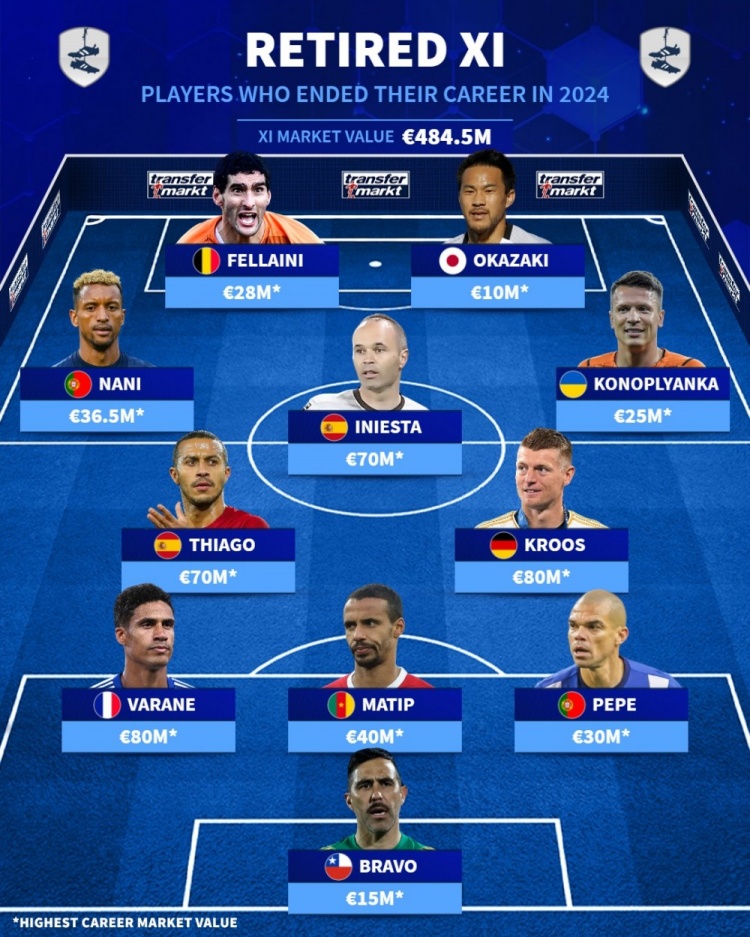 1月1日訊 德國轉(zhuǎn)會市場列出了2024年退役陣容,伊涅斯塔、克羅斯、瓦拉內(nèi)、佩佩在列。