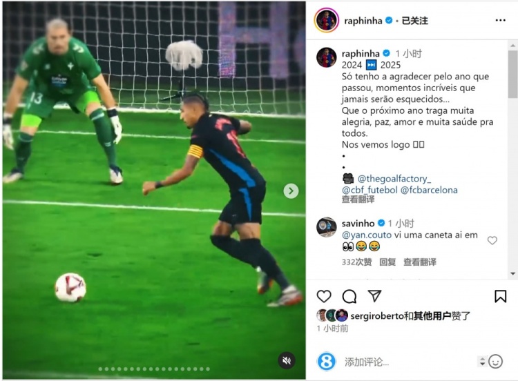 拉菲尼亞曬出自己的精彩表現(xiàn)集錦,并配文:“2024→2025。過去的一年我唯有感謝,那些難以置信的時刻永遠不會被忘記。”