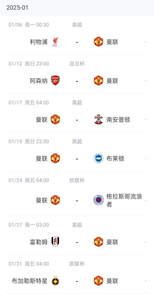 曼聯(lián)在2025年的頭兩場(chǎng)比賽將是在客場(chǎng)對(duì)陣?yán)锲趾桶⑸{。