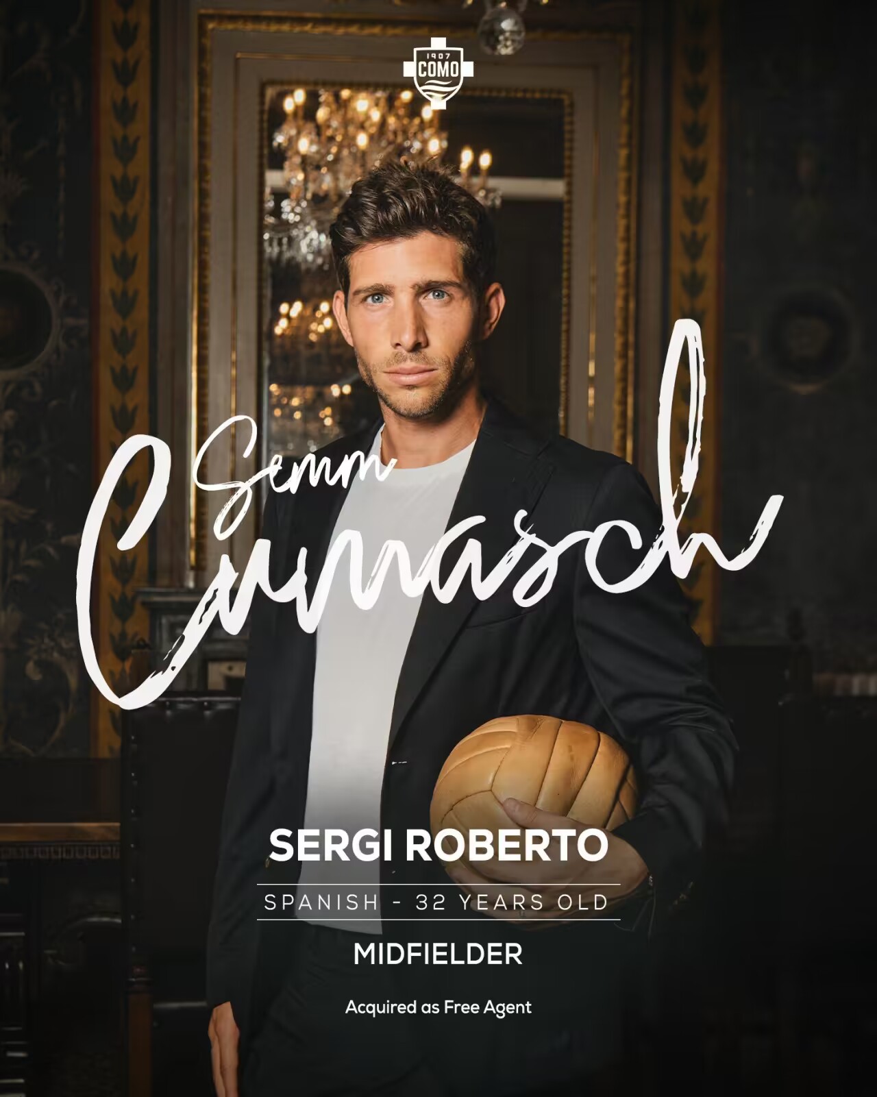 上個(gè)夏窗,前巴薩隊(duì)長羅貝托自由身加盟科莫,雙方簽約2年。羅貝托為巴薩一隊(duì)踢了14個(gè)賽季,他在2010年為巴薩一隊(duì)上演首秀,共出場373次,打進(jìn)19球,隨隊(duì)贏得7次西甲冠軍、2次歐冠冠軍、6次國王杯冠軍、6次西班牙超級(jí)杯冠軍、2次歐洲超級(jí)杯冠軍和2次世俱杯冠軍。
