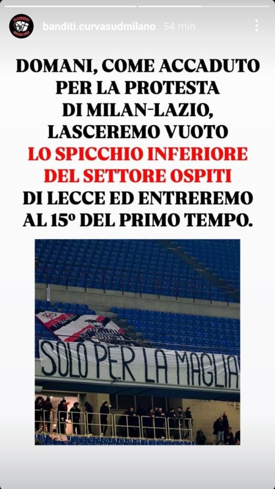 米蘭南看臺(tái)球迷組織在社交平臺(tái)上宣布:“明天,就像米蘭-拉齊奧時(shí)發(fā)生的抗議一樣,我們將會(huì)在萊切球場(chǎng)客隊(duì)坐區(qū)制造一片空?qǐng)?,我們將?huì)從上半場(chǎng)第15分鐘再進(jìn)場(chǎng)。”