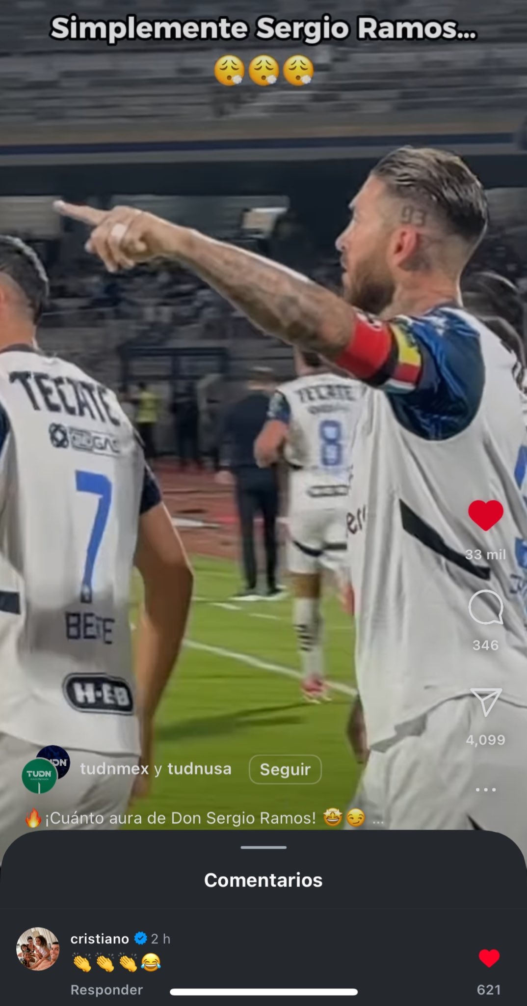 賽后,老隊友C羅在拉莫斯進球的社媒留下三個鼓掌和一個笑哭
