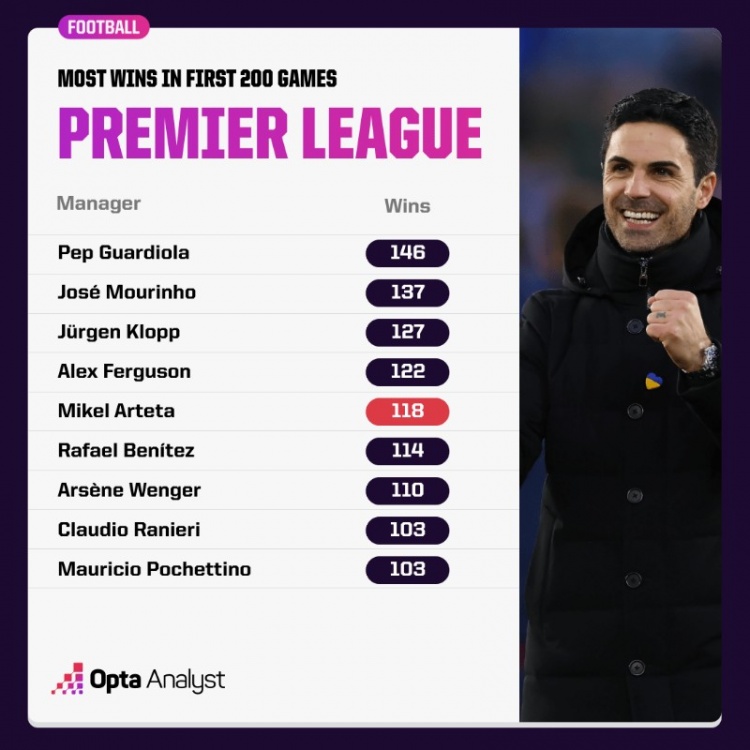 3月10日訊 阿森納在本輪英超焦點(diǎn)戰(zhàn)客場(chǎng)1-1戰(zhàn)平曼聯(lián),阿爾特塔在個(gè)人執(zhí)教英超200場(chǎng)里程碑未能獲得勝利。不過數(shù)據(jù)統(tǒng)計(jì)顯示,他仍然是英超歷史200場(chǎng)勝率第5高的主教練。