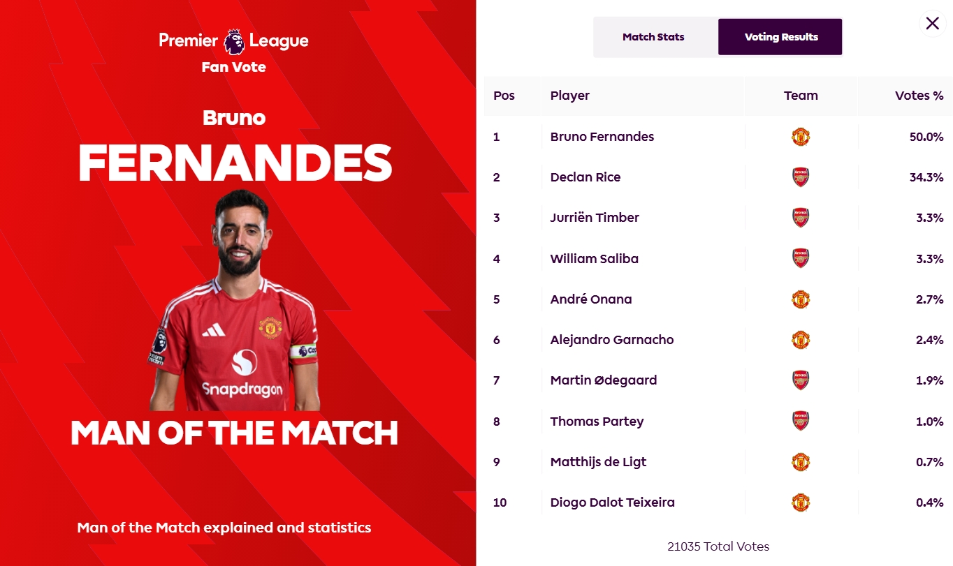 本場比賽,B費(fèi)打入一個任意球世界波,為曼聯(lián)首開記錄,賽后他獲得50%的票數(shù),被評為全場最佳。