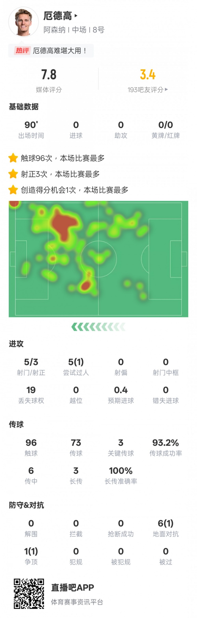 3月10日訊 英超第28輪,阿森納客場1-1曼聯(lián),厄德高首發(fā)出戰(zhàn),貢獻3次關鍵傳球,創(chuàng)造1次進球機會,傳球成功率93.2%,但也有19次丟失球權,評分7.8。