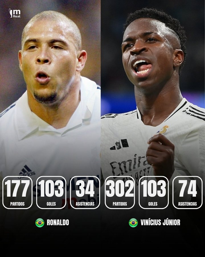 統(tǒng)計表明,維尼修斯現(xiàn)在已經(jīng)為皇馬打進(jìn)103球,追平同胞羅納爾多,成為皇馬隊(duì)史進(jìn)球并列最多的巴西球員。