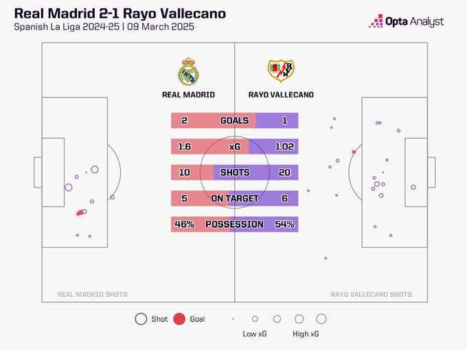 OPTA統(tǒng)計(jì)表明,本場比賽巴列卡諾有20次射門,而皇馬只有10次,這是除了面對巴薩之外,皇馬自2008年1月以來在西甲主場與對手最大的射門次數(shù)差。