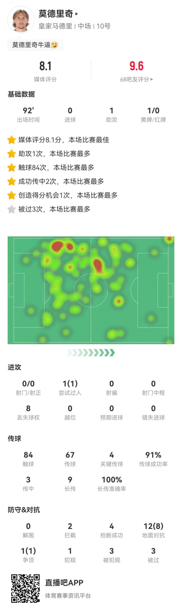 3月10日訊 皇馬在本輪西甲2-1力克巴列卡諾,莫德里奇本場數(shù)據(jù)如下: