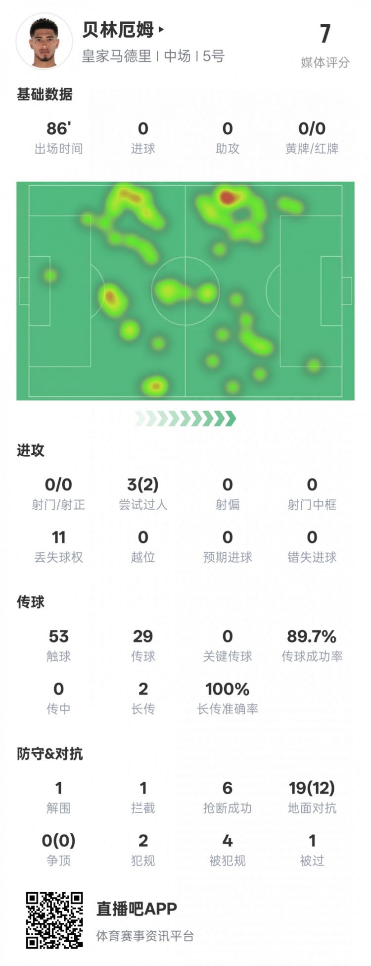 貝林厄姆本場比賽數(shù)據(jù)如下: