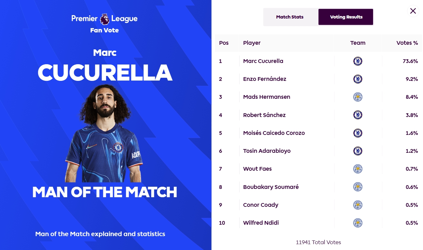 3月10日訊 英超第28輪,切爾西1-0萊斯特城。庫(kù)庫(kù)雷利亞首發(fā)出戰(zhàn),賽后以73.6%得票率當(dāng)選全場(chǎng)最佳。