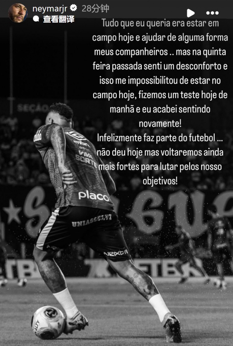 3月10日訊 今天,桑托斯在巴西錦標半決賽的比賽中1-2不敵科林蒂安,內(nèi)馬爾在社媒發(fā)文說明了他未能登場的原因。