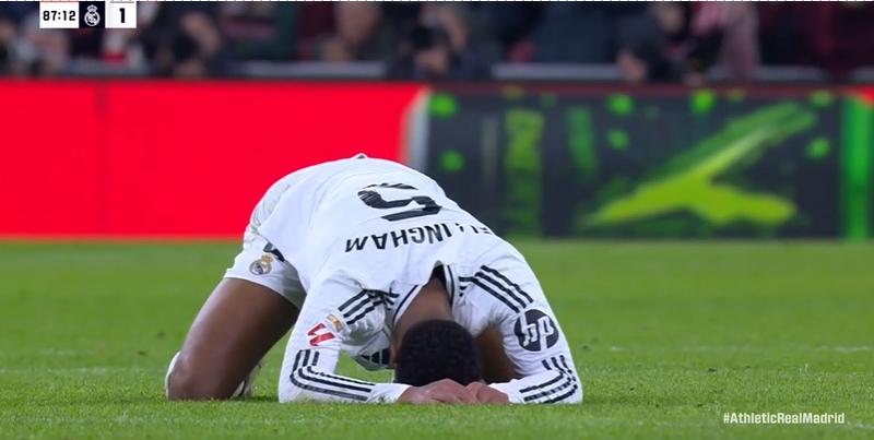 第88分鐘,導(dǎo)播同時(shí)回放了這兩粒進(jìn)球,皇馬丟球時(shí)貝林厄姆無(wú)奈趴地喘著粗氣。