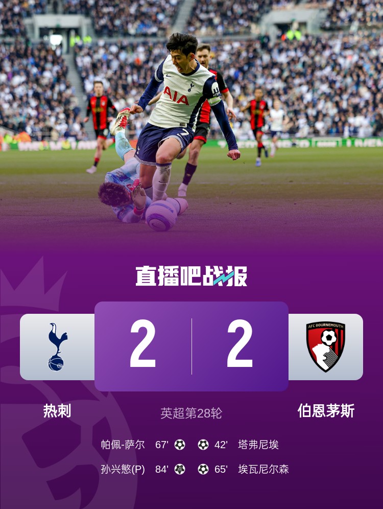 熱刺2-2戰(zhàn)平伯恩茅斯,薩爾、孫興慜破門,熱刺未能主場全取3分。