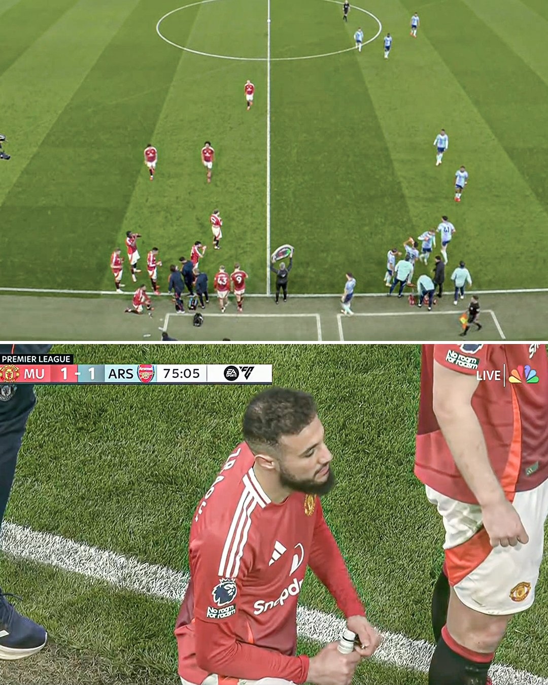 03月10日訊 本輪英超曼聯(lián)主場(chǎng)1-1戰(zhàn)平阿森納,比賽第76分鐘,就在賴斯破門(mén)后,主裁將球員叫到場(chǎng)邊,給了一次補(bǔ)水的機(jī)會(huì)。