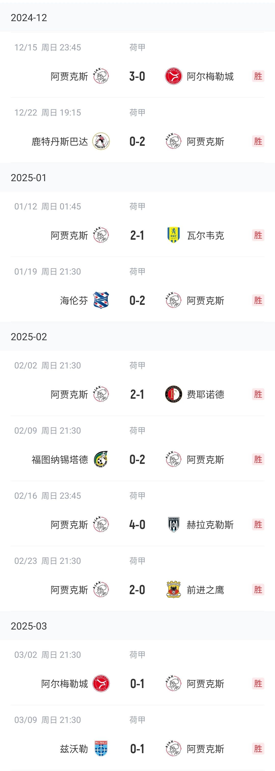 本賽季在35歲的意大利少帥法雷奧利的帶領(lǐng)下,阿賈克斯還剩9輪8分領(lǐng)跑荷甲積分榜,有望時隔2個賽季重奪荷甲冠軍。