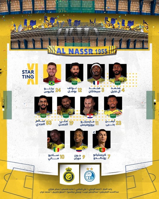 利雅得勝利首發(fā):24-本托、12-納瓦夫、3-西馬坎、4-法蒂爾、83-納吉迪、19-哈桑、11-布羅佐維奇、23-葉海亞、10-馬內(nèi)、9-杜蘭、7-C羅