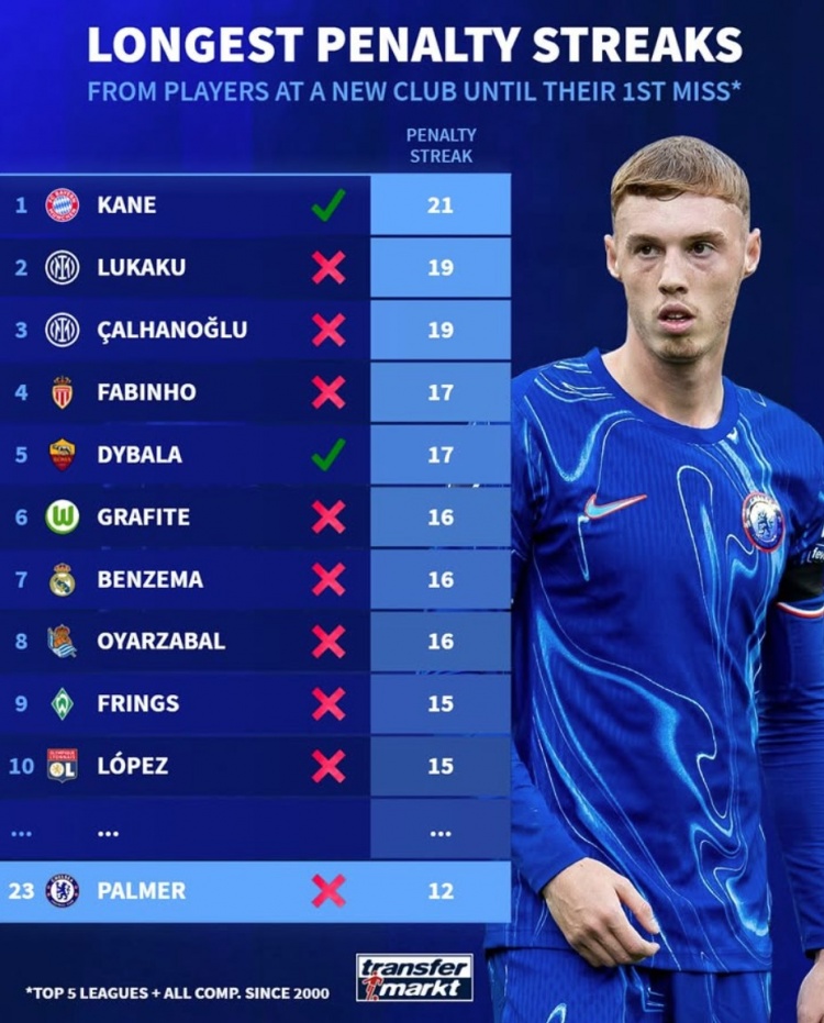 《轉(zhuǎn)會市場》統(tǒng)計(jì)了新世紀(jì)以來五大聯(lián)賽球員在新東家在不罰丟情況下連續(xù)命中點(diǎn)球紀(jì)錄,凱恩21球居首并且仍未罰丟。