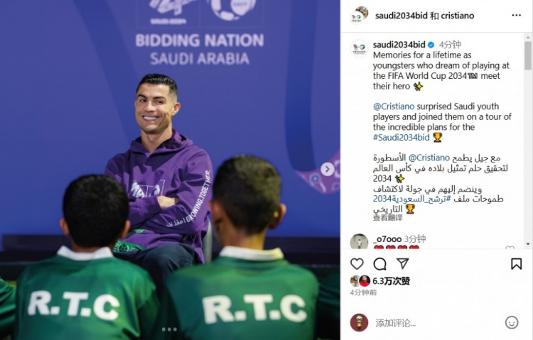 沙特世界杯申辦委員會(huì)曬出了C羅與沙特小球員們見面的照片,并寫道:“夢(mèng)想?yún)⒓?034年世界杯的年輕球員終身難忘的回憶!C羅給沙特年輕球員一個(gè)驚喜,加入他們一起參觀了沙特申辦2034世界杯的美妙計(jì)劃!”