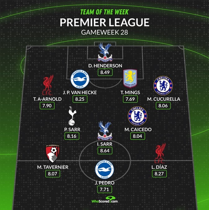 3月11日訊 英超第28輪聯(lián)賽已經(jīng)完賽,whoscored也評(píng)出了本輪聯(lián)賽最佳陣容,利物浦和切爾西各2人入圍。