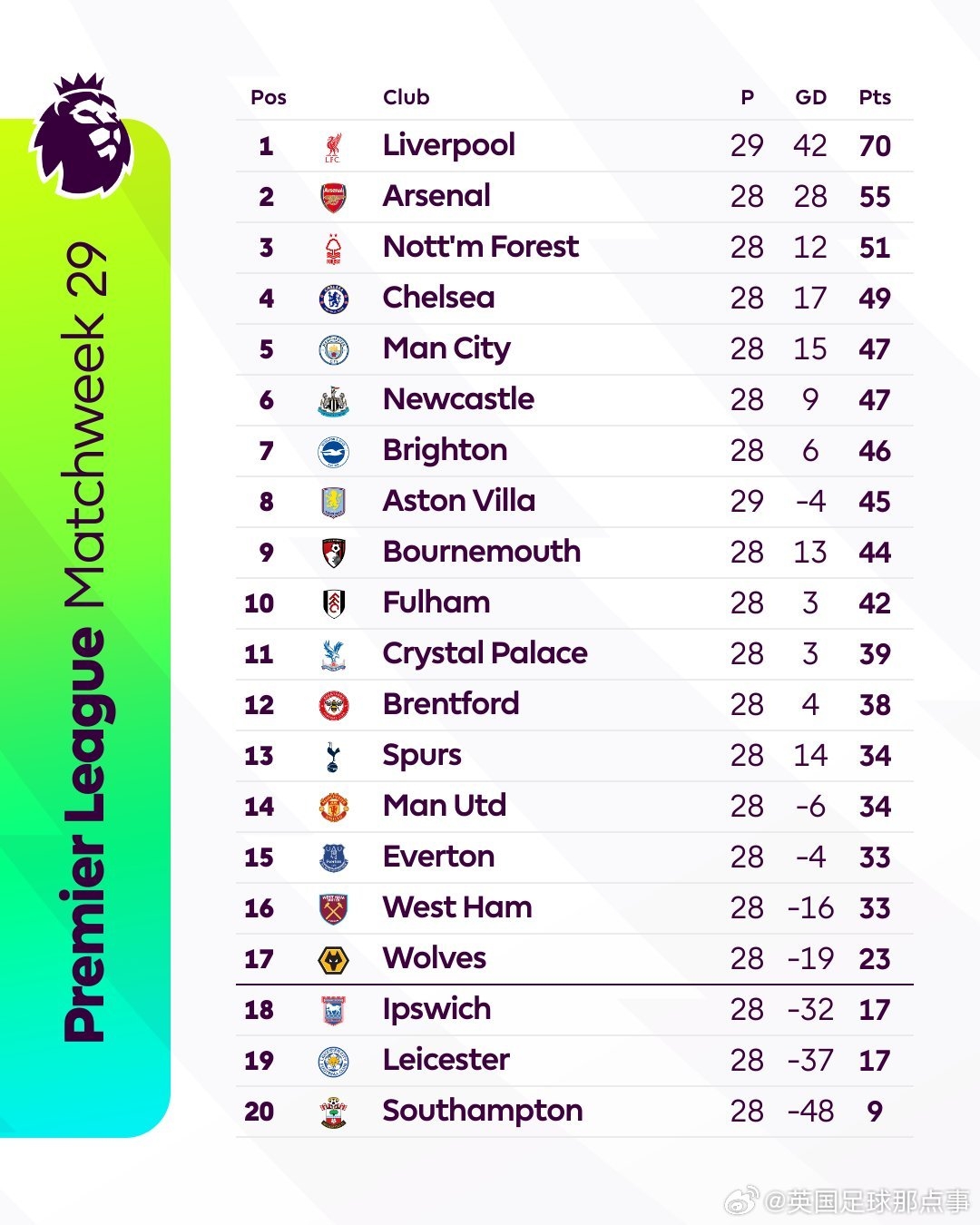 發(fā)布時(shí)間:2025年03月11日 18:00點(diǎn)擊:欄目:足球新聞 一切皆有可能 除特別注明外,本站所有內(nèi)容均為24直播網(wǎng)整理排版,轉(zhuǎn)載請(qǐng)注明出處:一切皆有可能英超第三名和第九名只差7分 ??? 本文標(biāo)簽: 足球 英超 轉(zhuǎn)載 諾丁漢森林 切爾西 曼城 紐卡斯?fàn)柭?lián) 布萊頓 阿斯頓維拉 伯恩茅斯