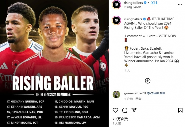 RB年度最佳新人獎(jiǎng)是由Rising Ballers組織設(shè)立的,旨在表彰在足球領(lǐng)域表現(xiàn)突出的年輕球員,福登、薩卡、亞馬爾等人曾奪得該獎(jiǎng)。