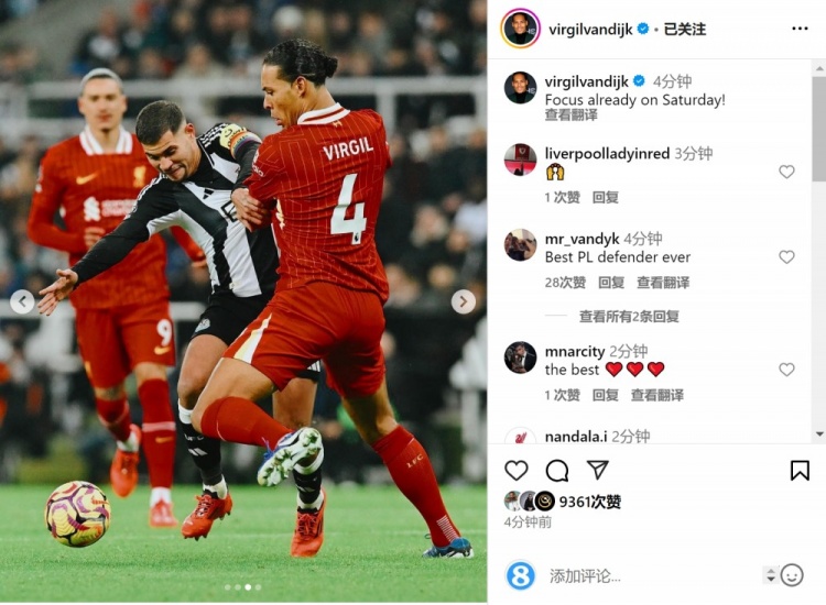 范迪克社媒曬出比賽照片,并配文:“已經(jīng)專注于周六的比賽了!”