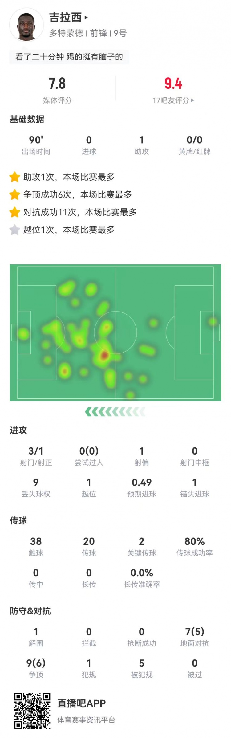 3月13日訊 多特在本輪歐冠2-1擊敗里爾,吉拉西本場數(shù)據(jù)如下: