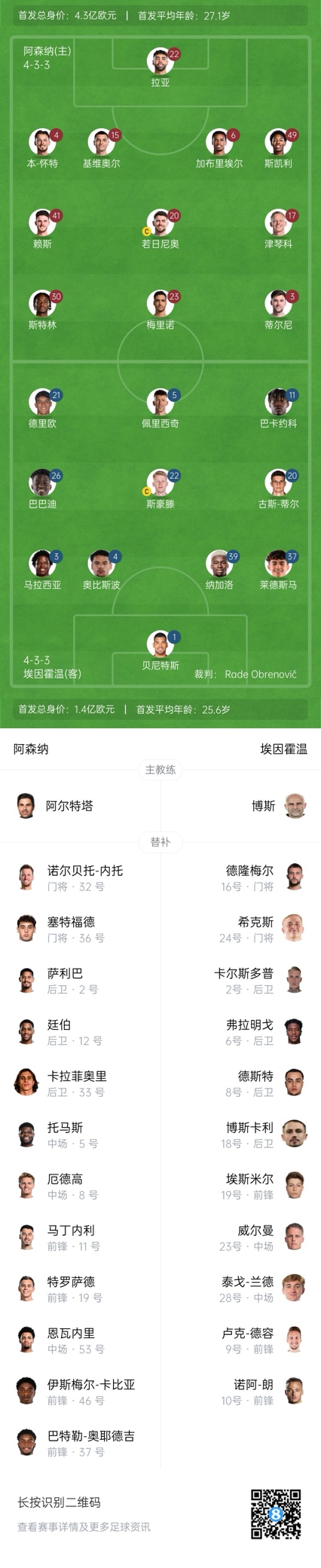 阿森納首發(fā):22-拉亞、4-本-懷特、15-基維奧爾、6-加布里埃爾、49-斯凱利、41-賴斯、20-若日尼奧、17-津琴科、30-斯特林、23-梅里諾、3-蒂爾尼