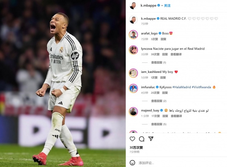 他也在賽后通過社媒曬出自己的怒吼慶祝照,并配文:“皇家馬德里