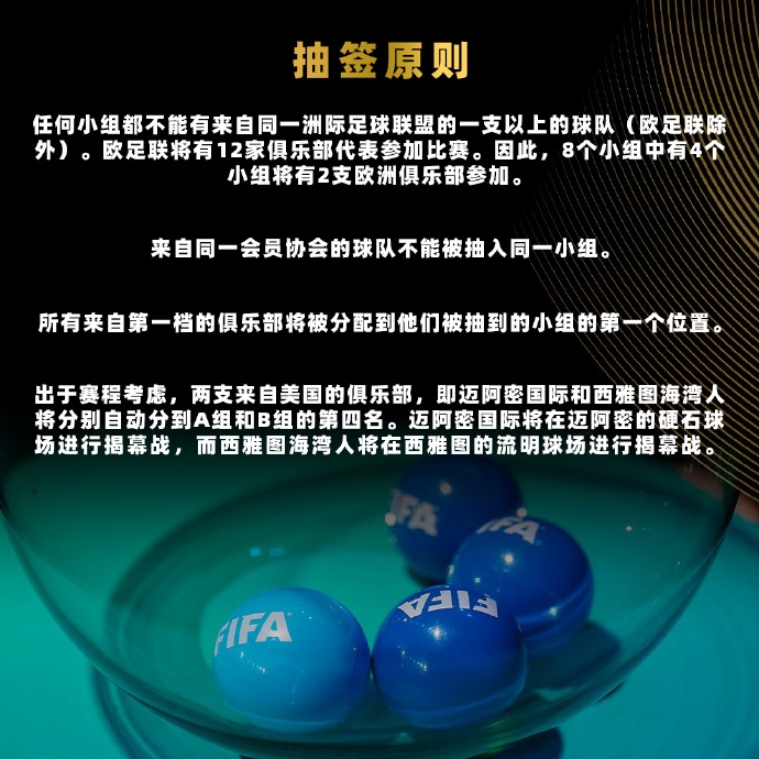 7、由于東道主球隊(duì)和日程安排的原因,邁阿密國際將自動分配到A組的第4位置,而西雅圖海灣人將在第四檔抽簽時自動分配到B組的第4位置。