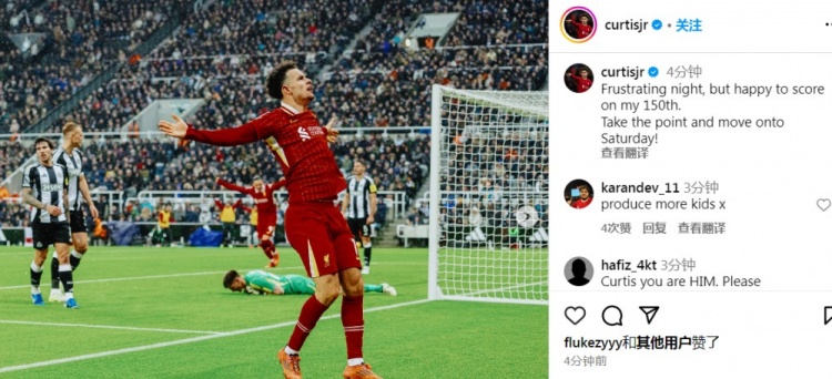 12月5日訊 英超第14輪利物浦3-3戰(zhàn)平了紐卡,比賽中柯蒂斯-瓊斯幫助球隊打進一球,賽后他也在ins上談到了這場比賽。